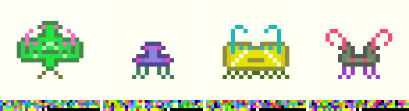 The shape, or morphology, of each animatroid or fungol is determined by its genes. Genes control the bending of internal bones or branches. Pixels cover the bones to create the shape of the body. The shape of the body and the number of different pixels determine the physiology of the life form.